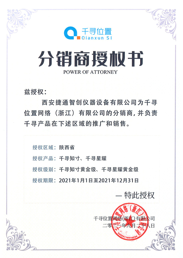 2021年9月28日千尋位置正式授權(quán)西安捷通智創(chuàng)儀器設(shè)備有限公司為千尋位置網(wǎng)絡(luò)(浙江)有限公司的分銷商,并負責(zé)千尋產(chǎn)品在下述區(qū)域的推廣和銷售。